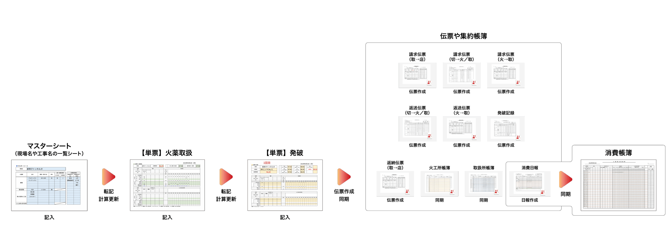 山岳トンネルやダム工事では、岩盤掘削に火薬類を用いた発破を行うことがあります。この火薬類は、火薬取締法の枠組に従って業界団体が自主的に定めた管理基準に則り、多くの種類の伝票や帳簿などの火薬類管理帳票を用いて安全に管理されています。経験と資格を持つ技術者・技能労働者が火薬類の保管場所や使用場所などの複数箇所の間のやり取りすべてを手書き・カーボン複写で記録し、サイン・捺印で確認・承認を行う、紙を用いた管理が行われてきました。